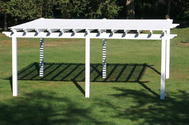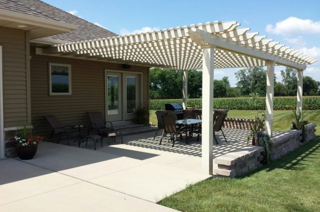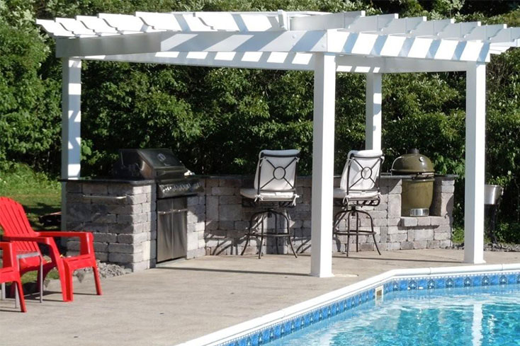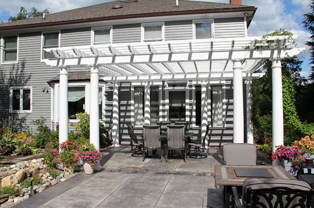 There are few better color combinations than that of a white vinyl pergola and the tan-looking stone of concrete. This luxury look alone makes installing a pergola on concrete a great choice! Poolside pergolas add resort-worthy style accents close to your favorite outdoor feature — while also providing some sought-after shade. Pergola placement for a patio is similar to installing it on a deck in that you have the same attached and detached options. Even more than on a deck, a patio pergola provides a much-needed vertical visual element. When installing a pergola on concrete, you’ll need a heavier duty hammer drill to attach the fasteners to the concrete. If you have that piece of equipment, though, it is not much different from installing it on a deck.
