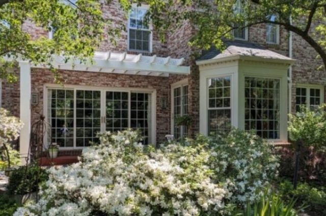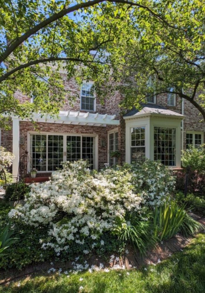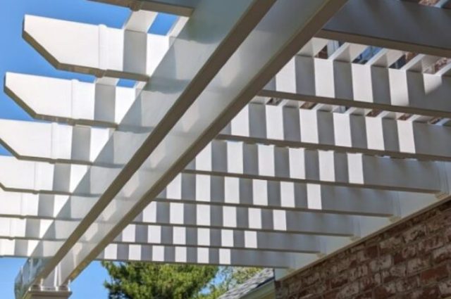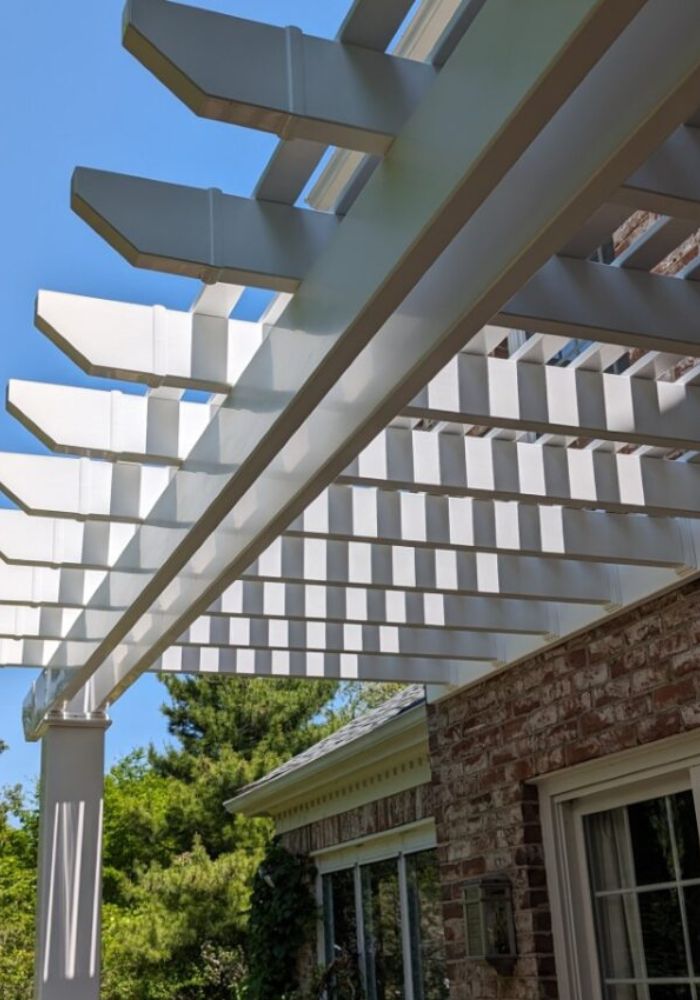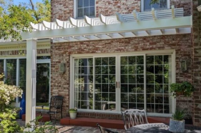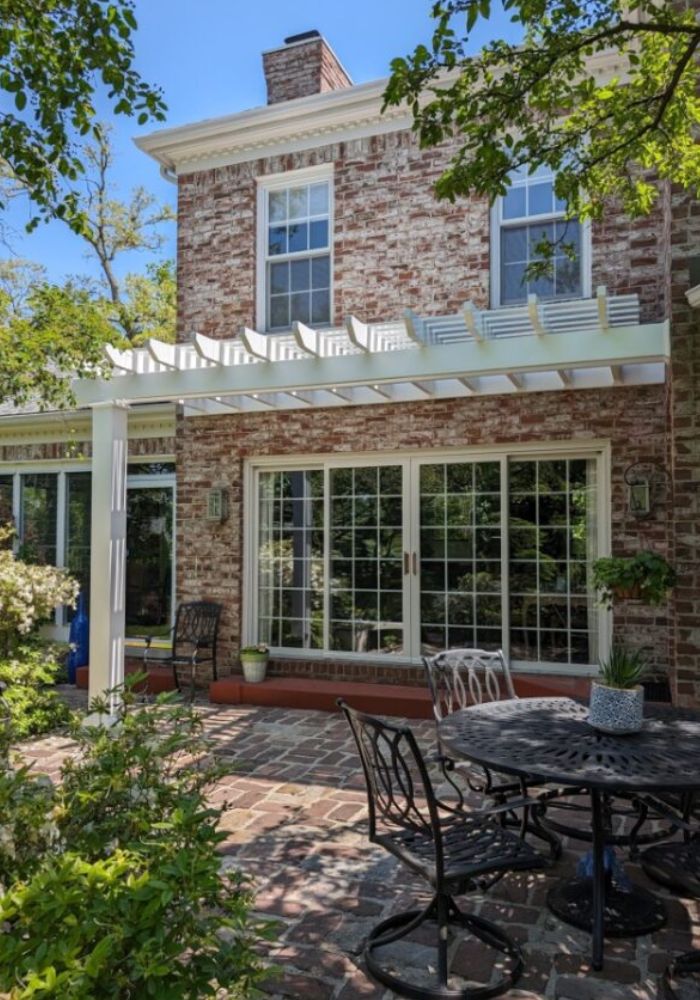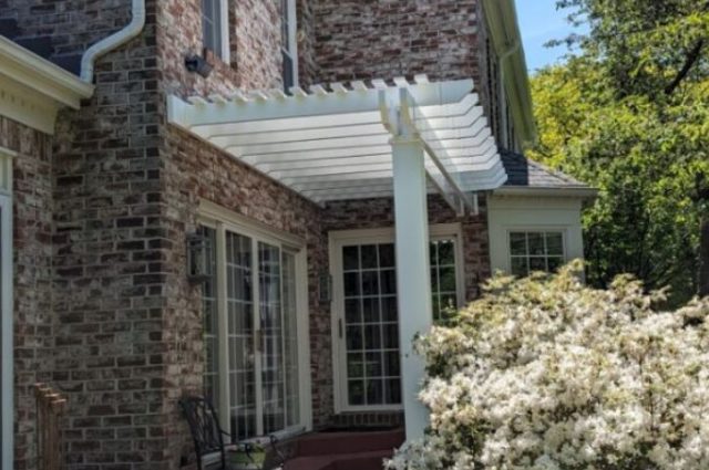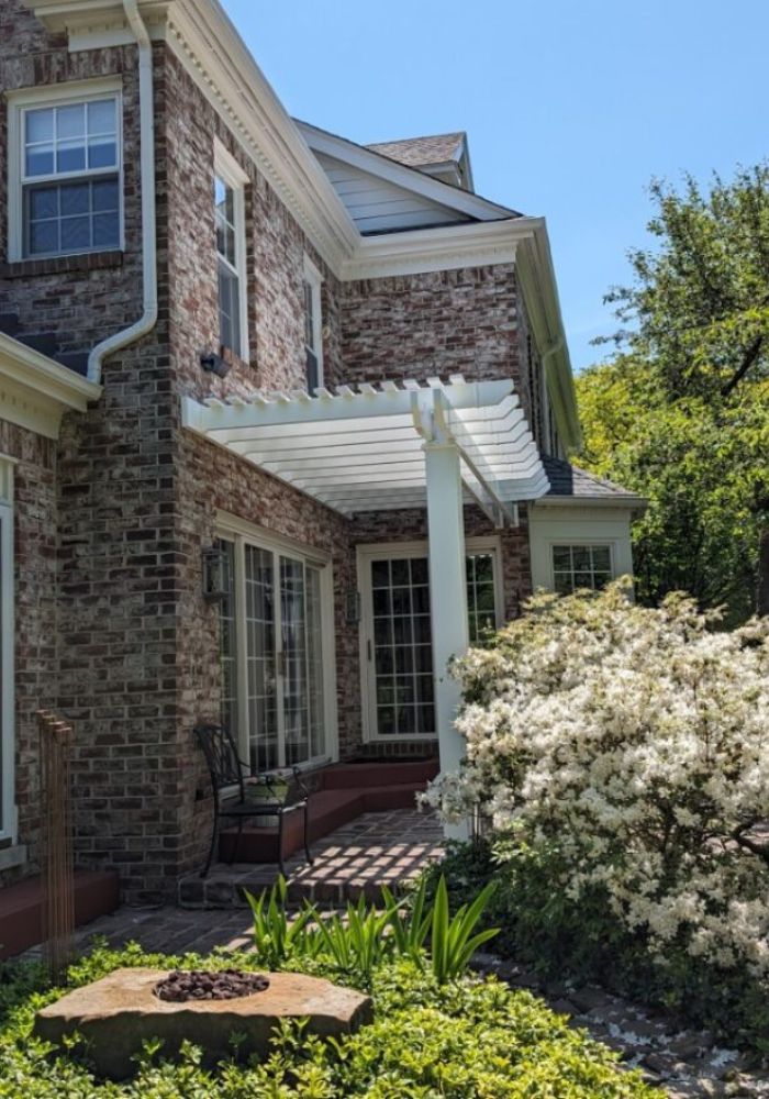This decorative attached pergola extends over sliding glass doors, seamlessly blending with the brick home and surrounded by lush greenery for a beautiful, natural touch.