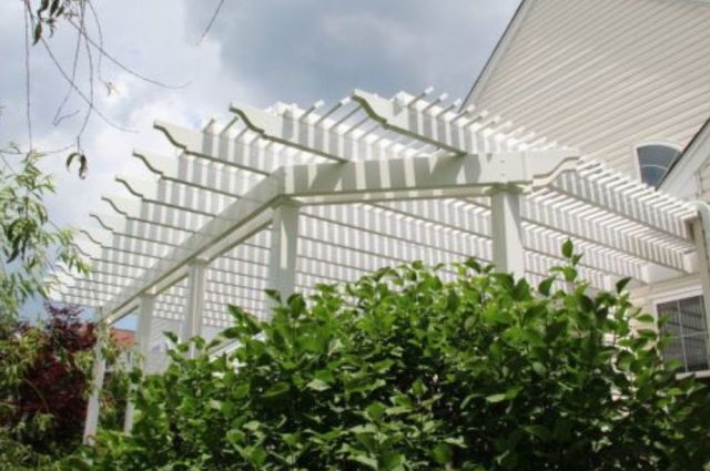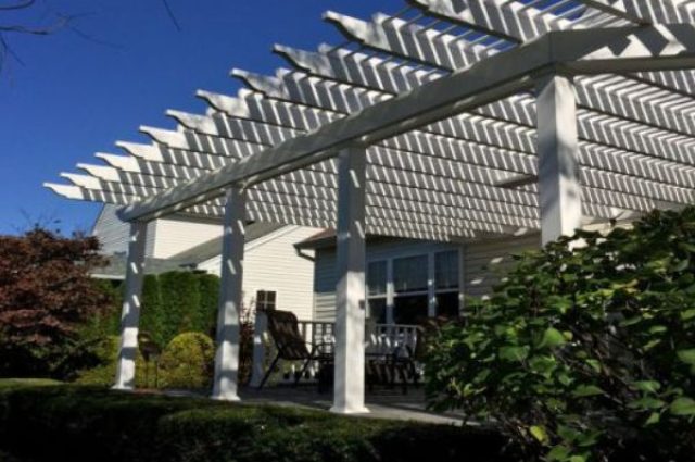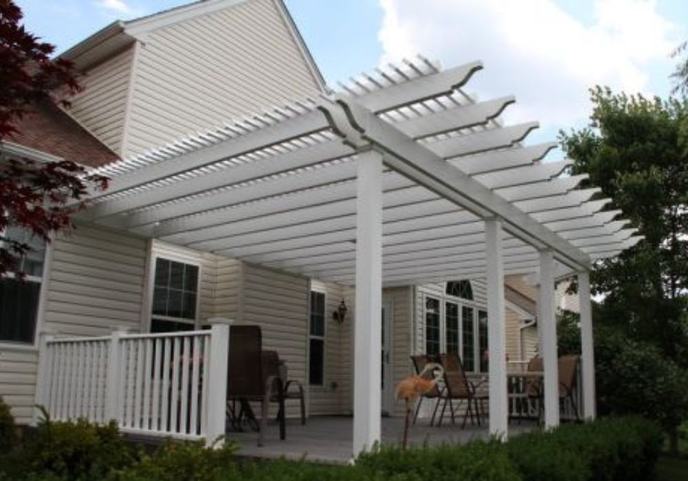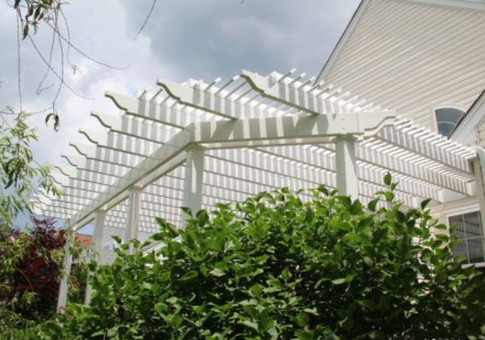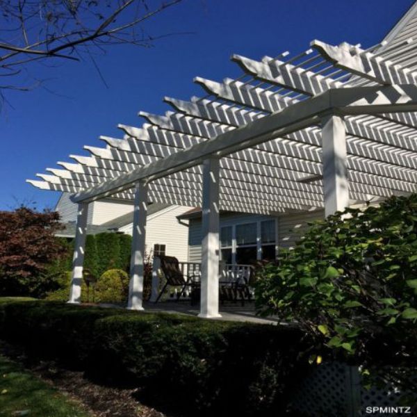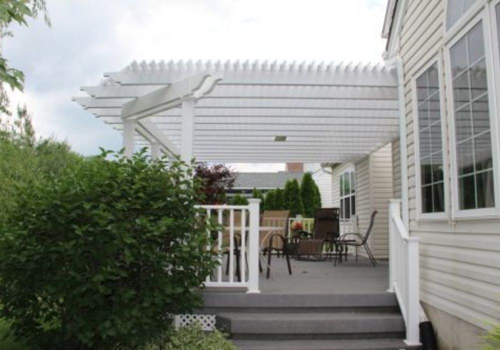 This custom-designed pergola with a 45-degree corner seamlessly matches the existing deck, adding aesthetic appeal and enhancing the overall look of the home.