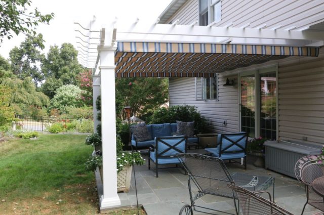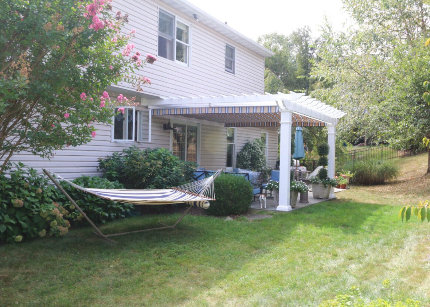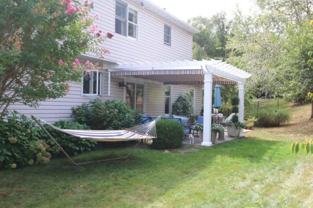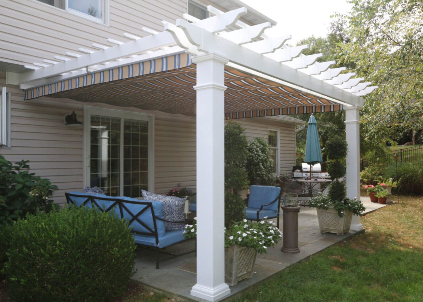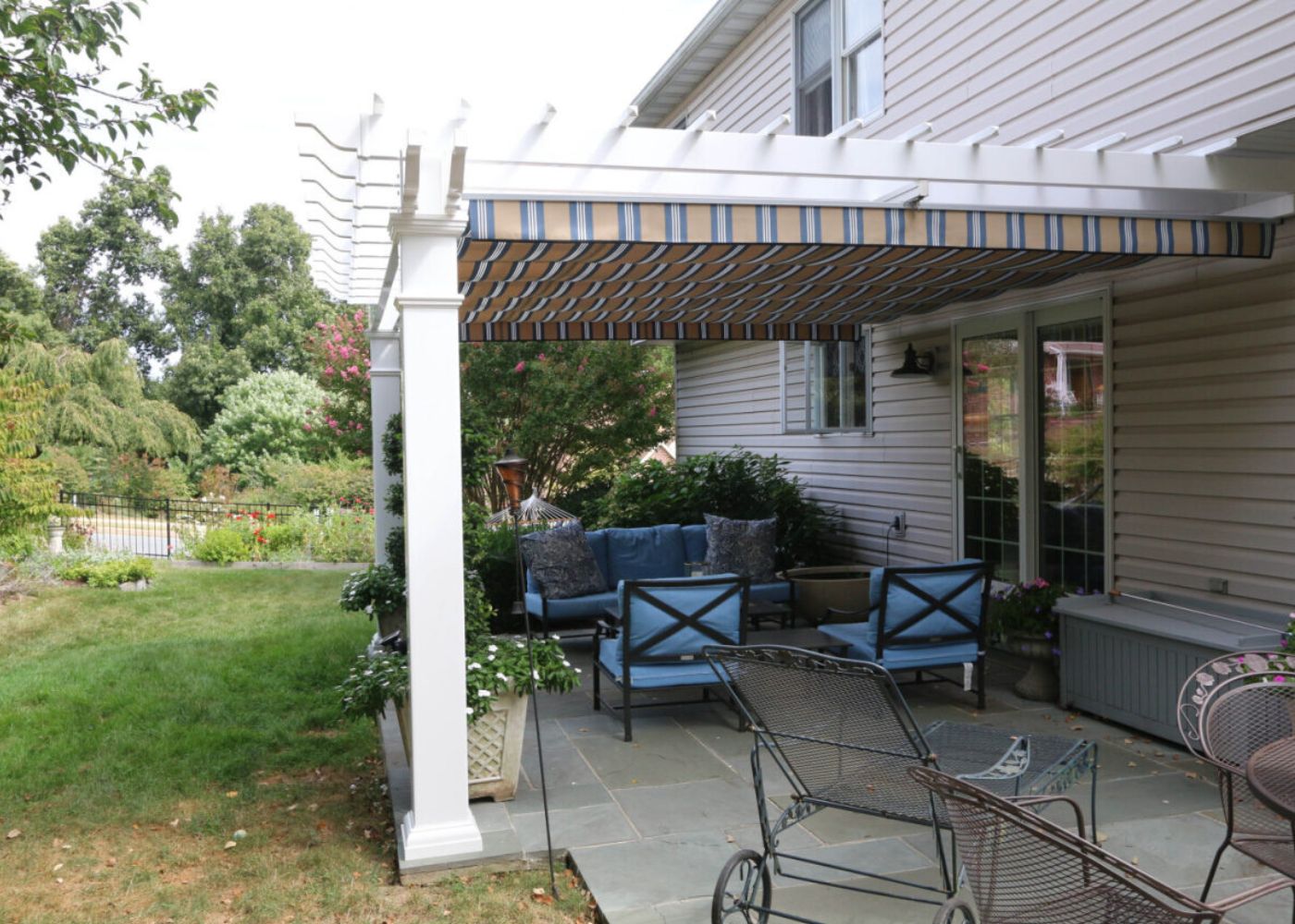 This tan attached pergola blends seamlessly with the greenery, providing shade over outdoor furniture with blue cushions for a perfect backyard getaway.