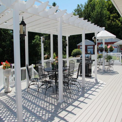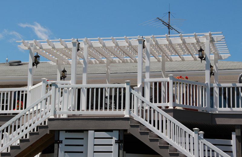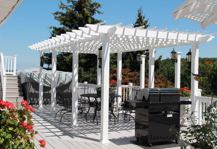 A stylish addition to the fenced-in deck, this white vinyl pergola provides much-needed shade and sun filtering, keeping the back of the home cool during summer. A cozy bistro set sits underneath, creating the perfect spot for relaxation.