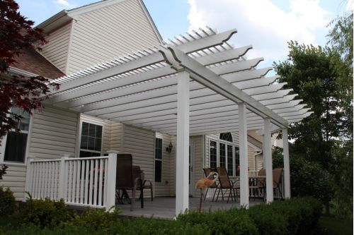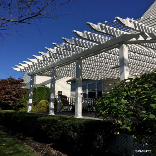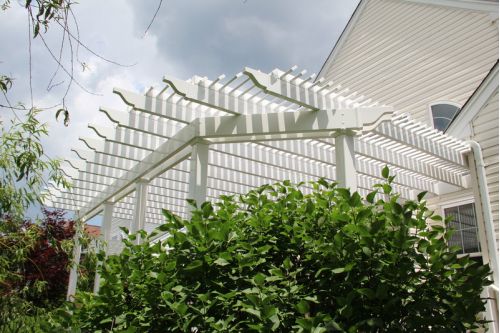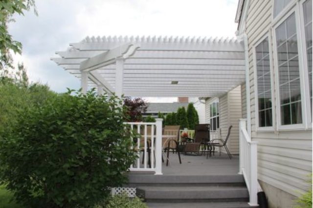 This custom-designed pergola with a 45-degree corner seamlessly matches the existing deck, adding aesthetic appeal and enhancing the overall look of the home.