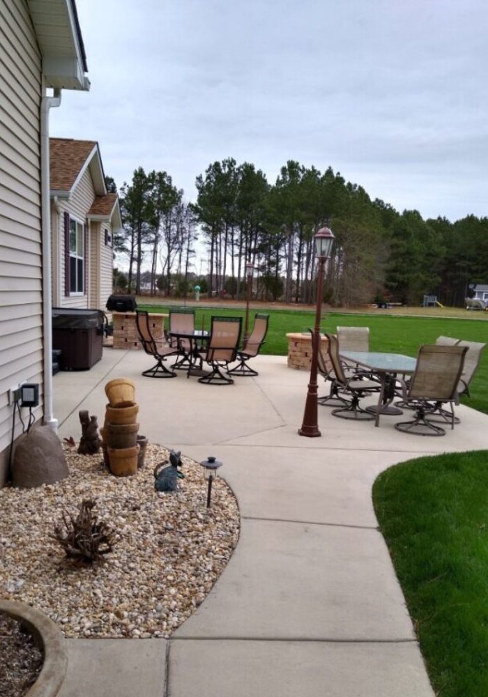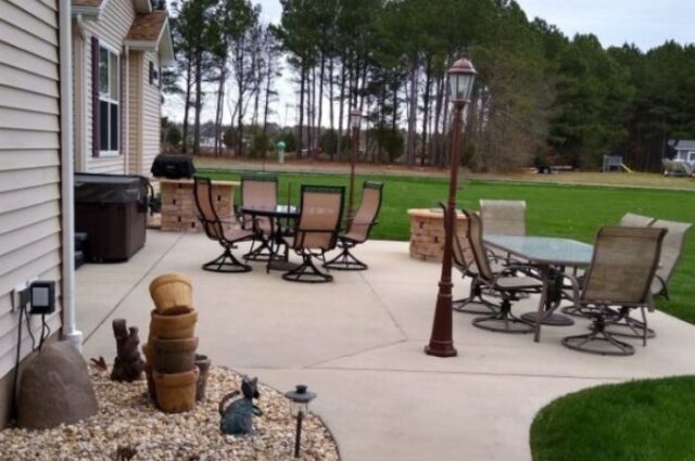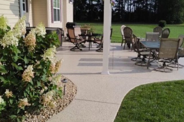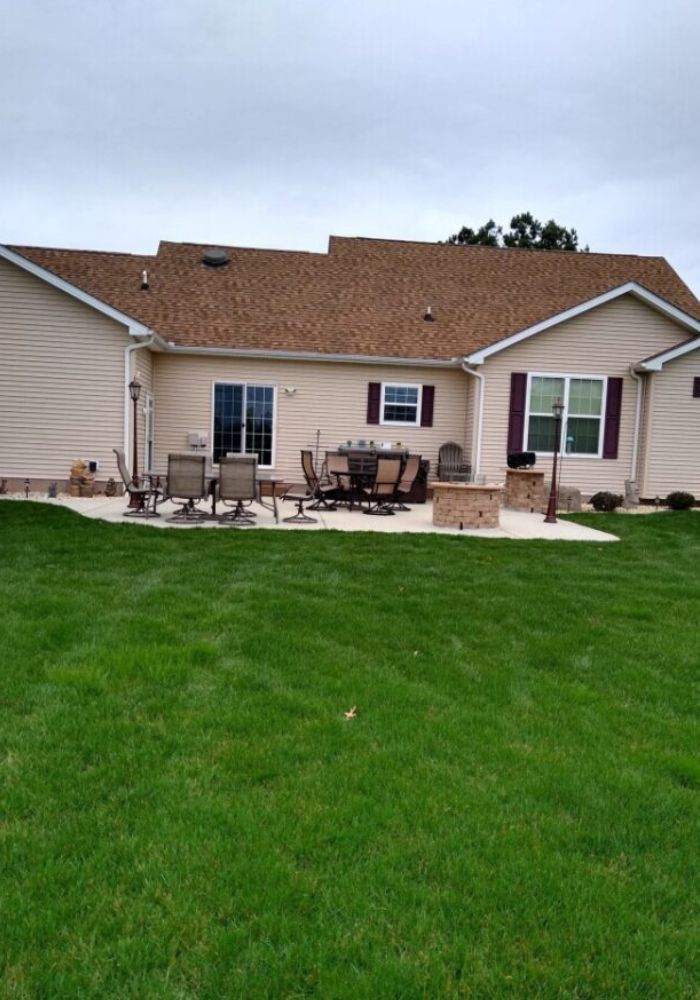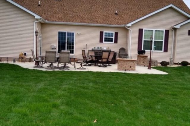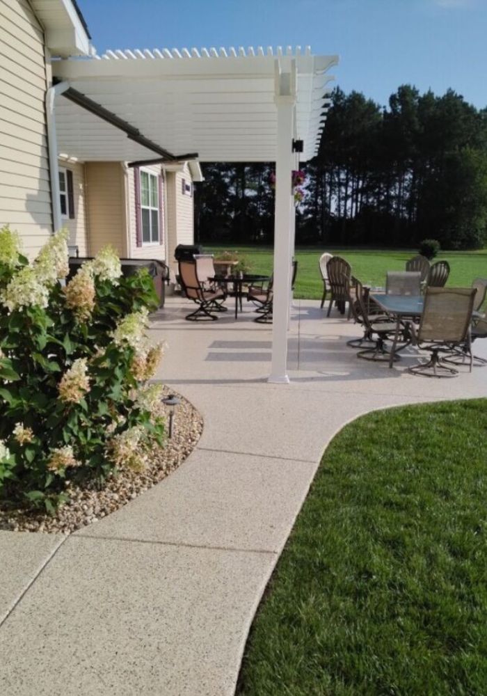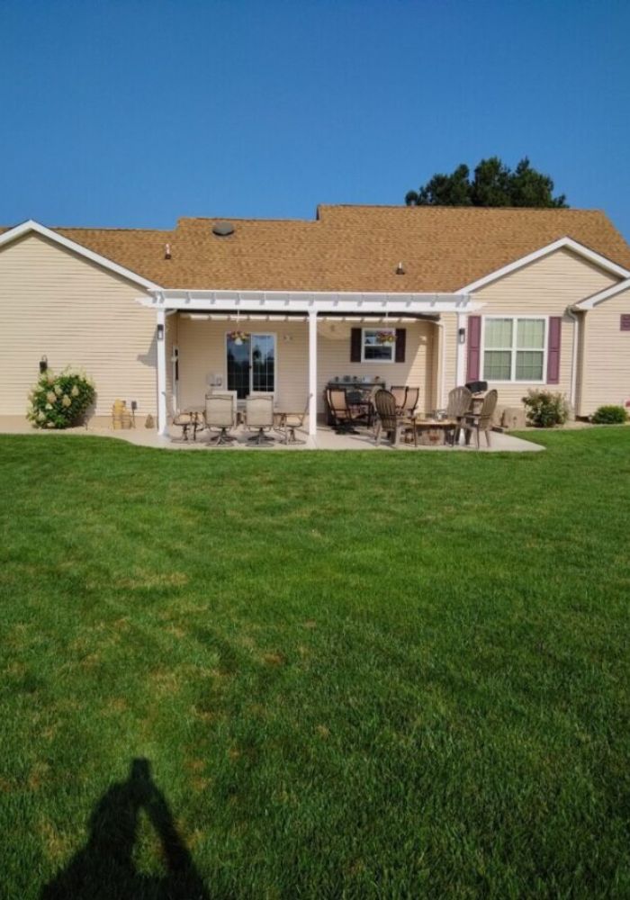 This wall-mounted pergola adds charm and shade to the backyard patio, perfectly framed by beautiful, green grass for a serene outdoor space.