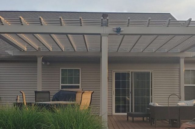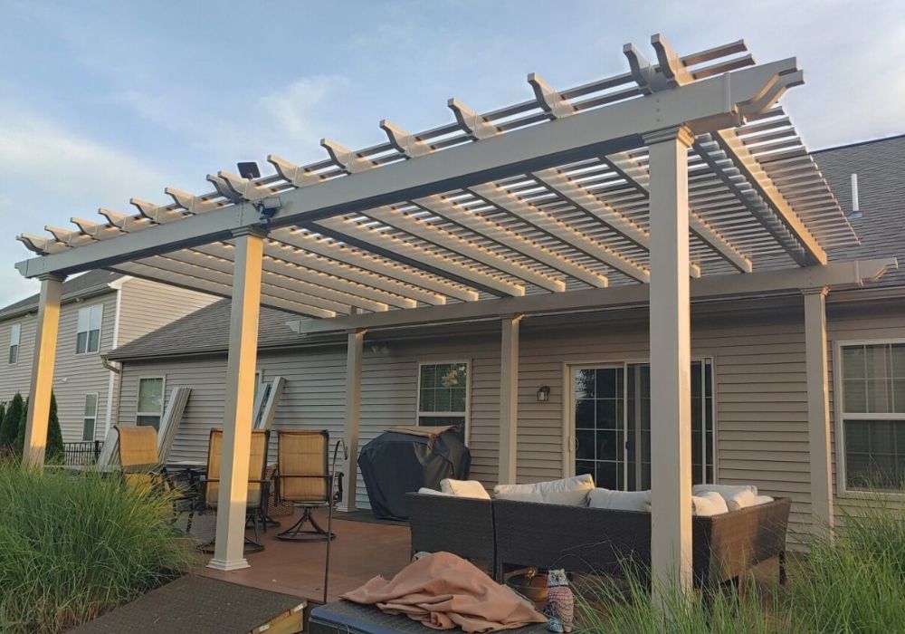 This all-tan attached pergola enhances the patio, offering a stylish and functional outdoor space that blends perfectly with the surrounding environment.