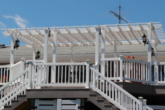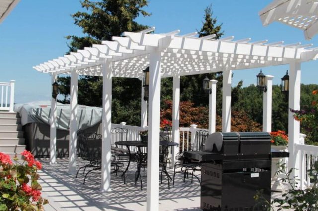 A stylish addition to the fenced-in deck, this white vinyl pergola provides much-needed shade and sun filtering, keeping the back of the home cool during summer. A cozy bistro set sits underneath, creating the perfect spot for relaxation.