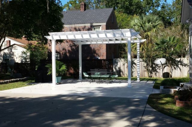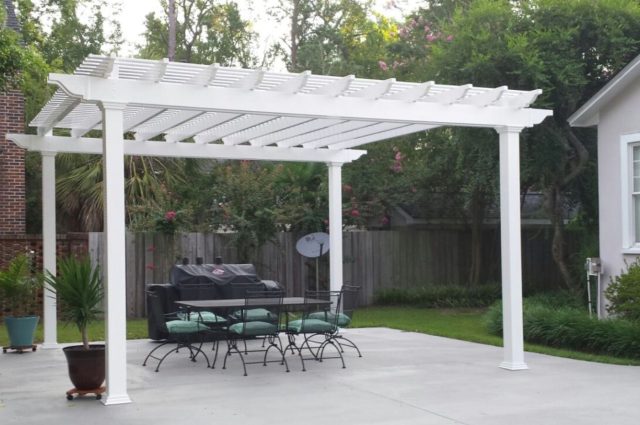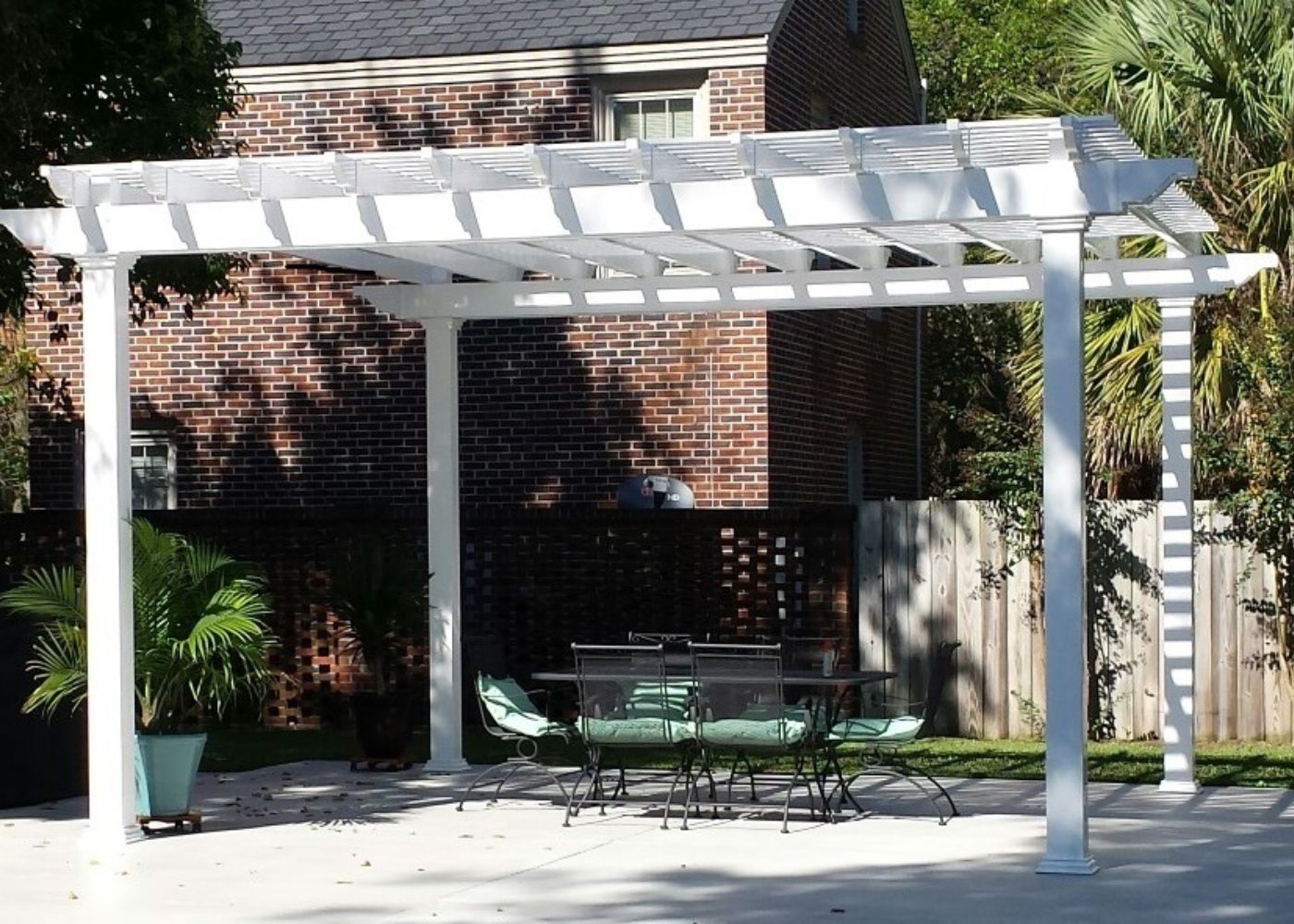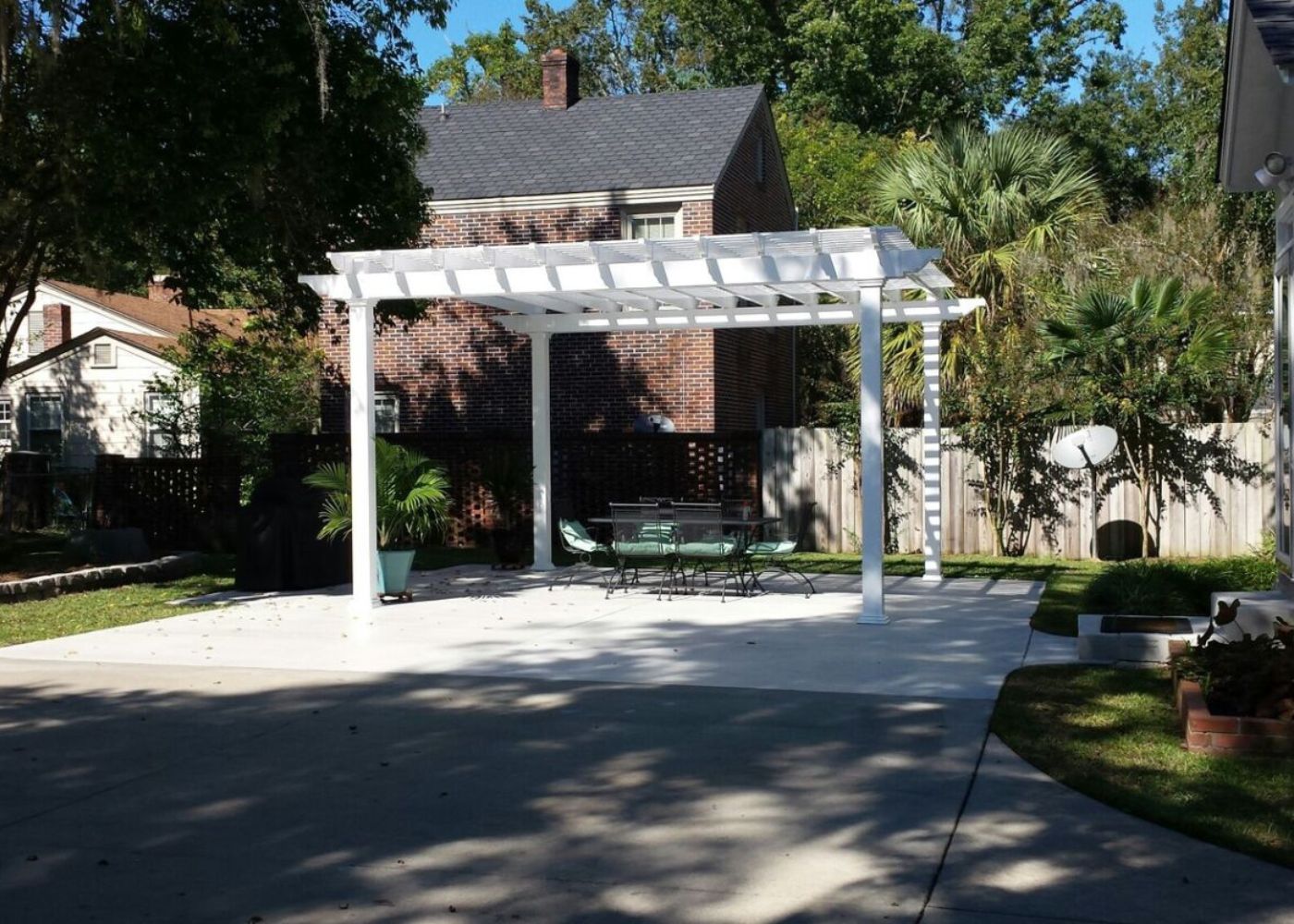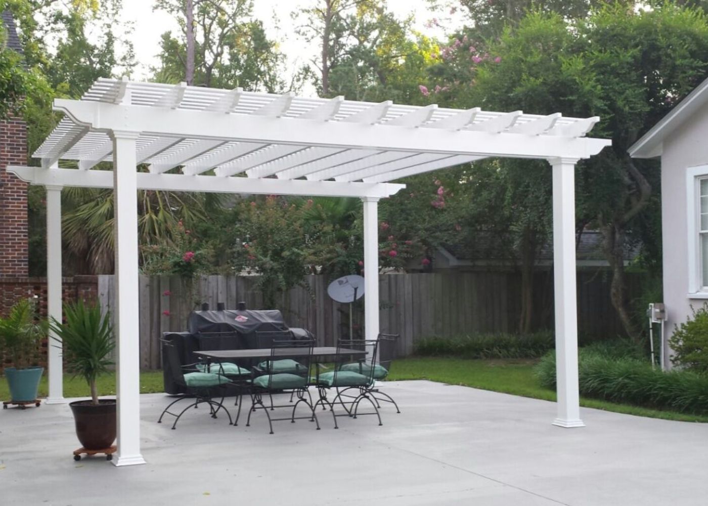 This free-standing white pergola creates a charming dining space over an outdoor set on a concrete patio, nestled in a fenced-in backyard.