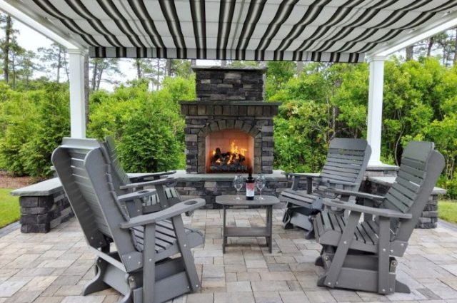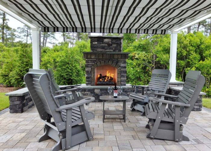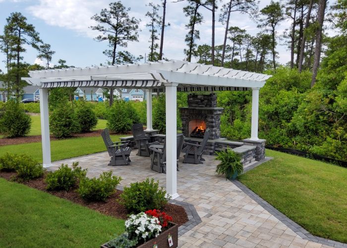 This white free-standing pergola enhances a stone brick patio, featuring an outdoor fireplace surrounded by Adirondack rocking chairs for a cozy and inviting atmosphere.