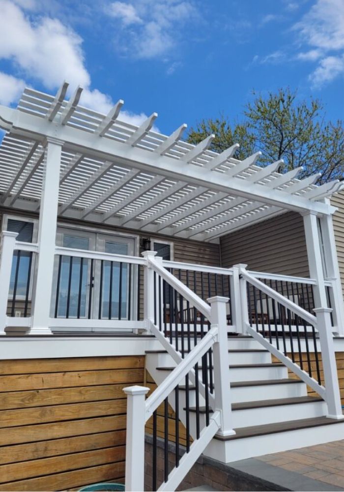 This white pergola and railing over a wood two-story deck beautifully enhance the tan house, creating a stylish and inviting outdoor space.