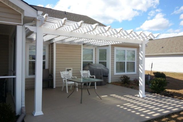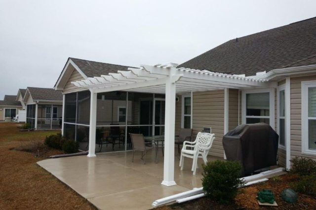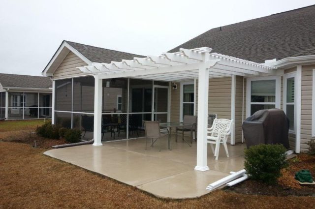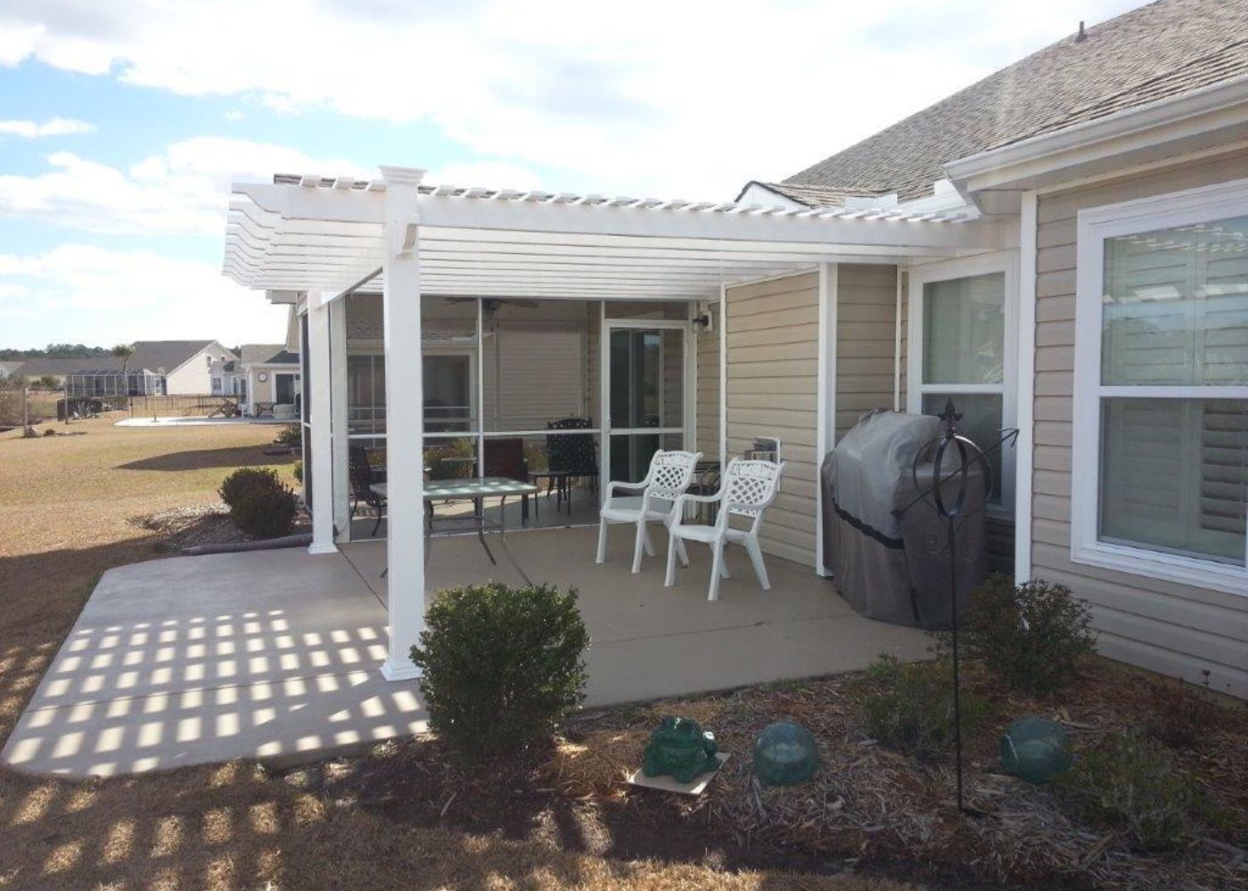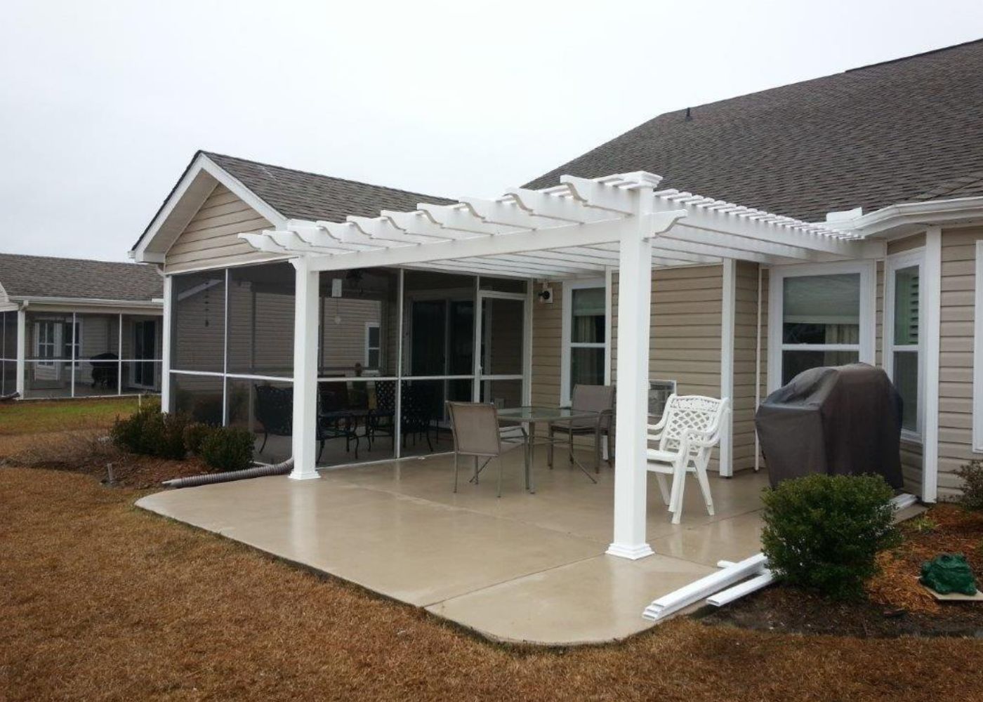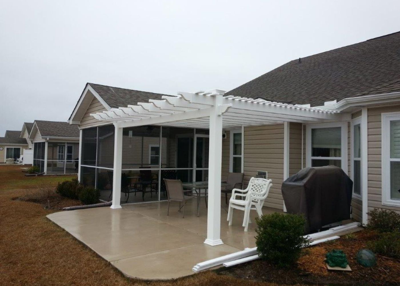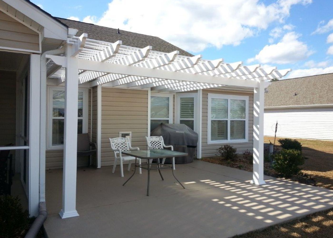 This white attached pergola spans a concrete patio with a grill and chairs, offering an ideal outdoor space next to a screened-in porch.