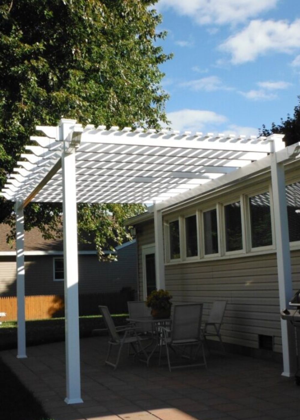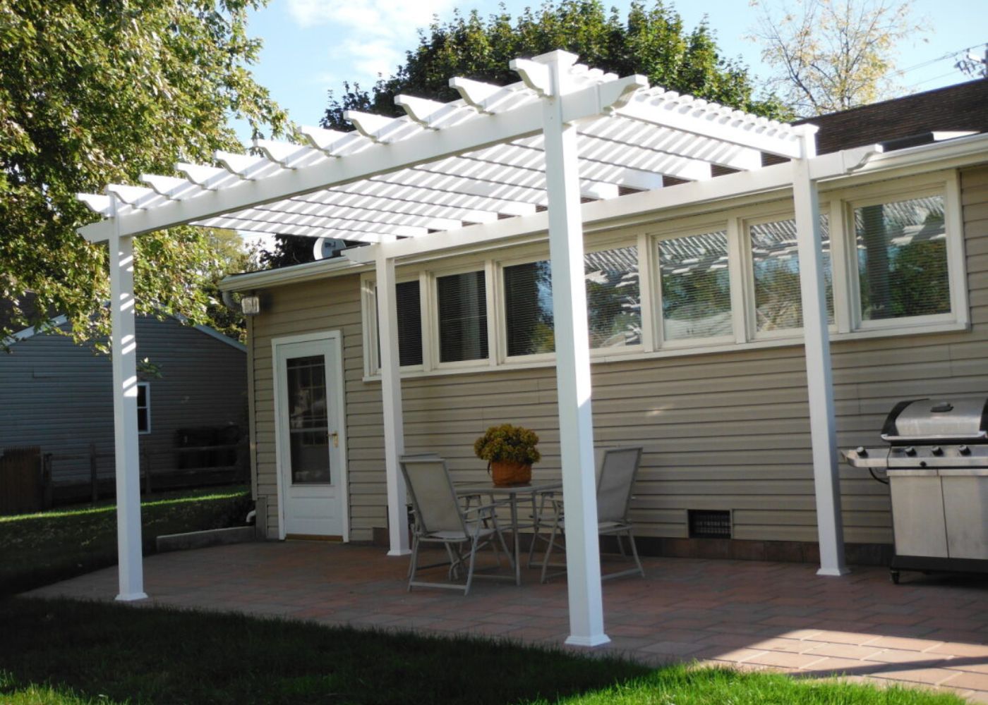 This white free-standing pergola creates an elegant setting over a grey bistro set on a charming brick patio, offering a cozy outdoor retreat.