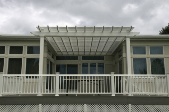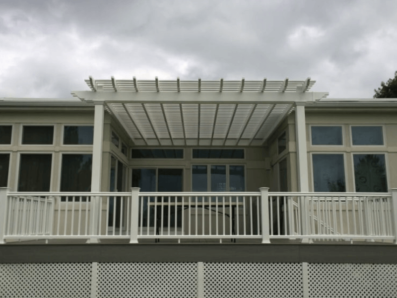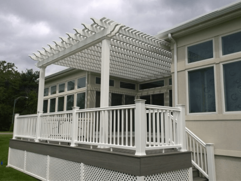 • white vinyl pergola over a two story deck with white vinyl railing around it