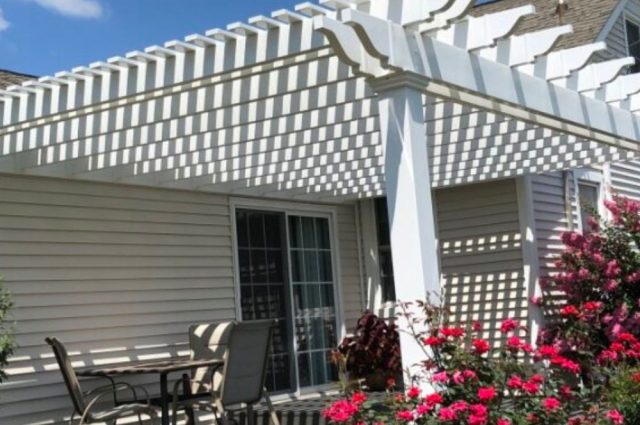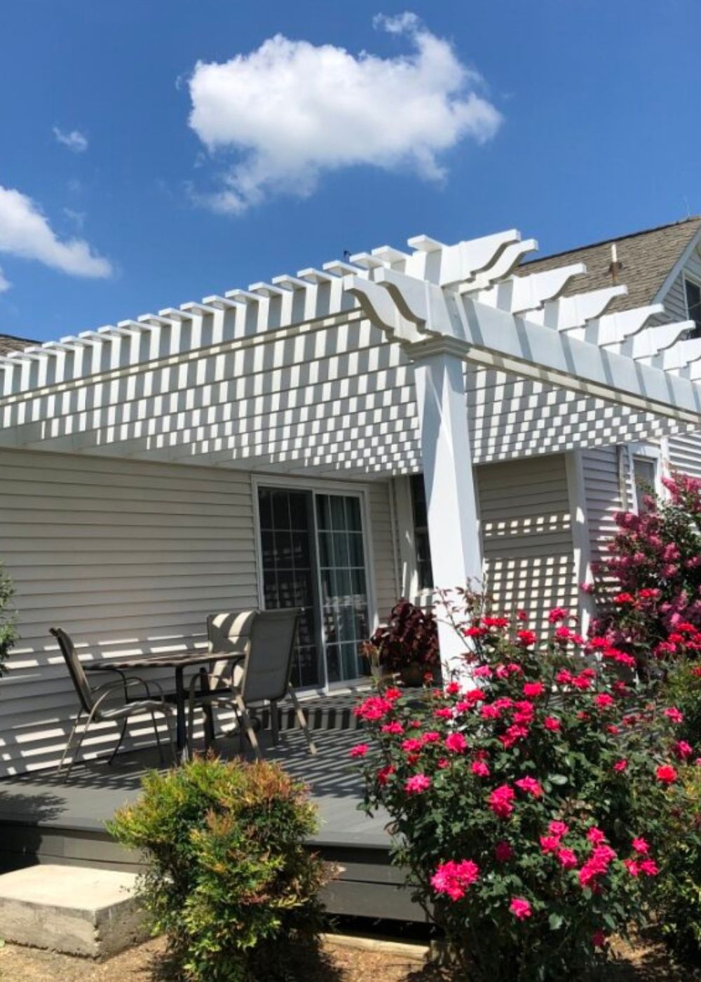 • white pergola kit creating a shaded patio with outdoor furniture, adjacent to house with sliding glass doors and flowers