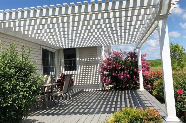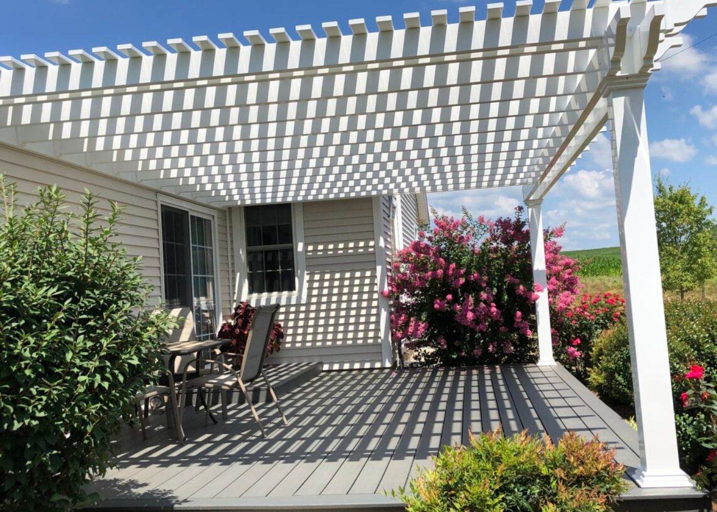 • white pergola elevated over a wooden deck, providing shade and an outdoor sitting area, surrounded by flowers and plants