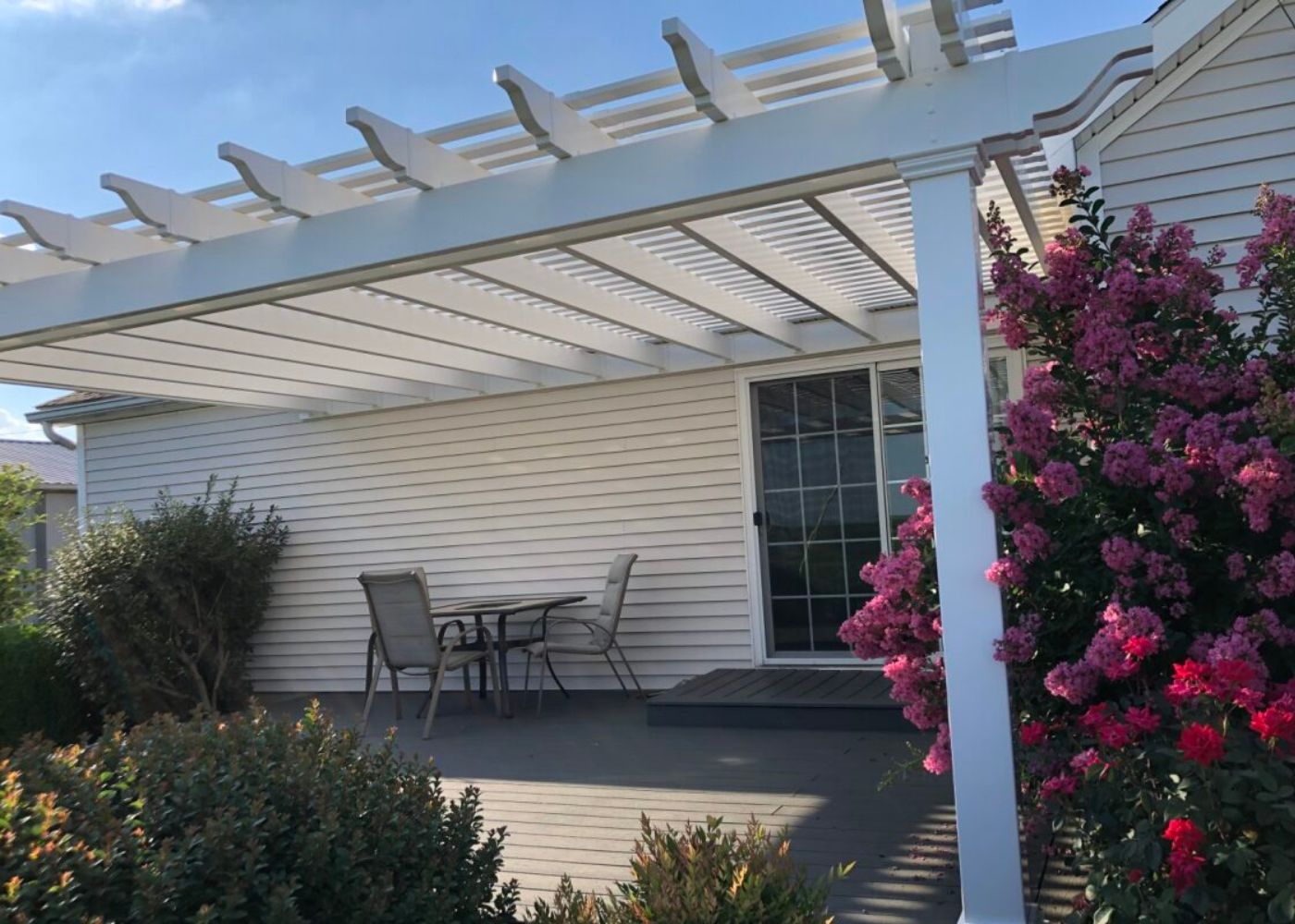• white outdoor pergola providing shade over patio with furniture, surrounded by blooming pink flowers and lush green bushes