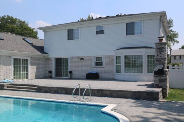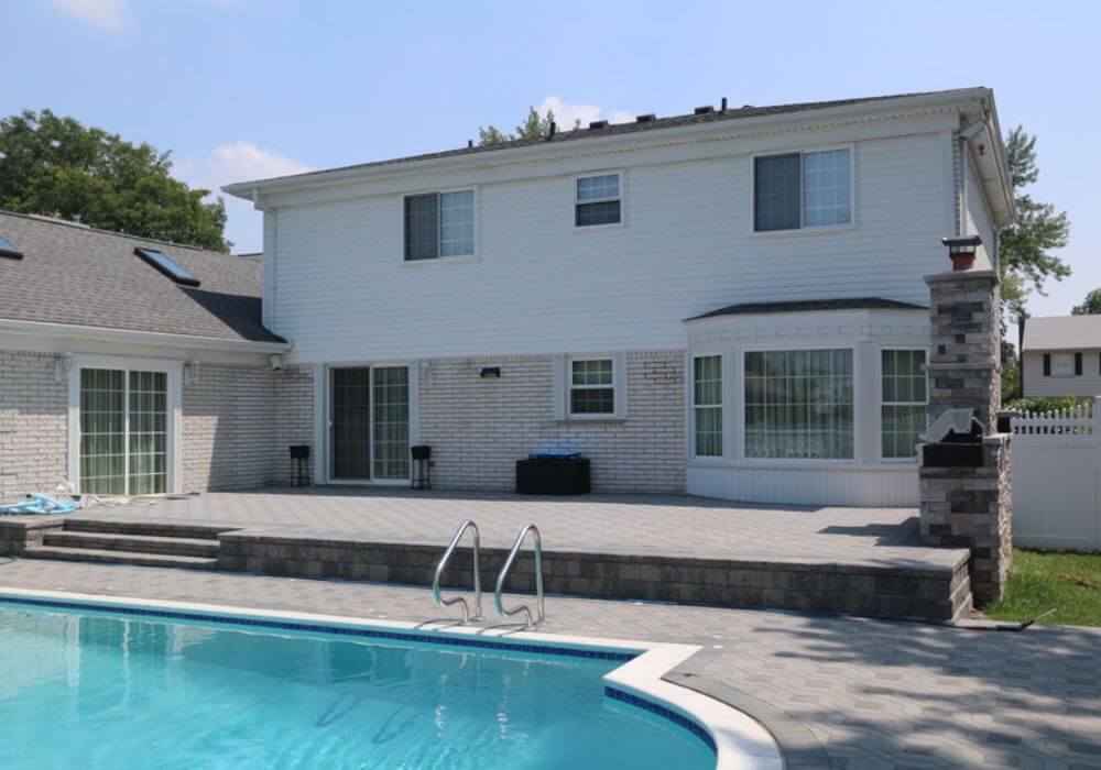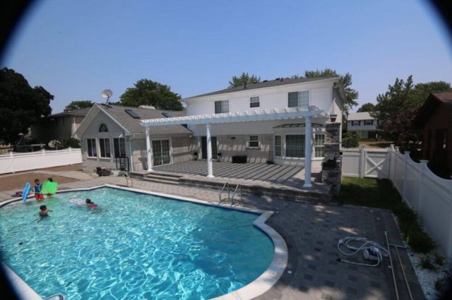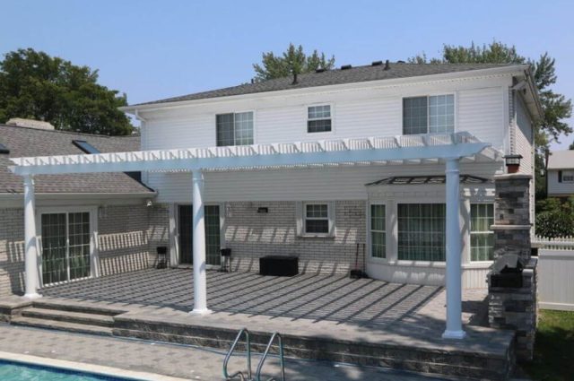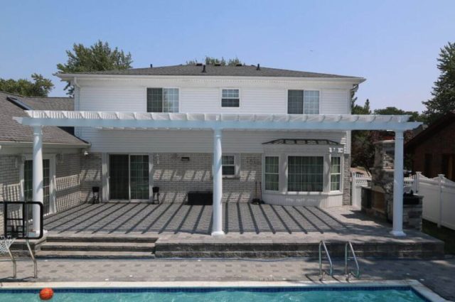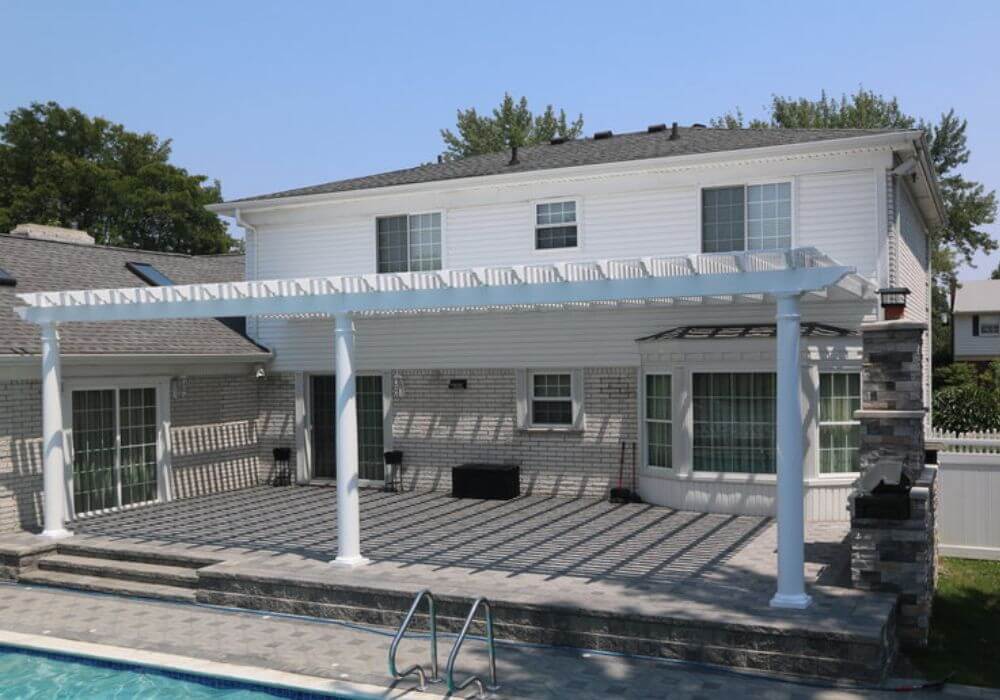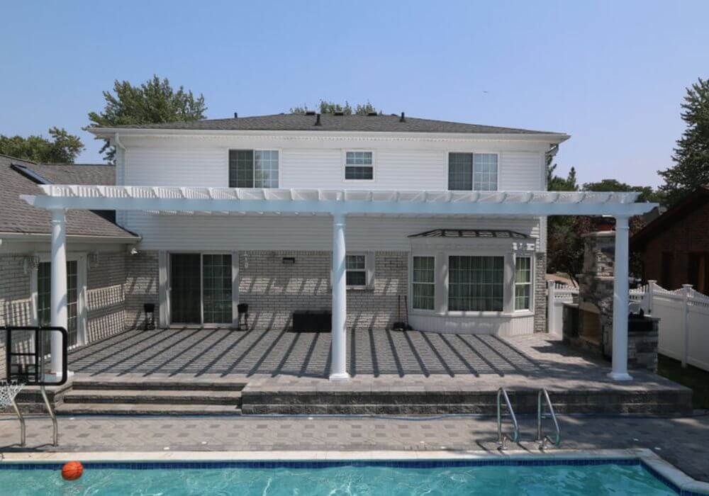 Thanks to our durable 2 x 6 aluminum design, this attached white pergola spans 18 feet without the need for a center post, transforming the poolside patio. Check out the stunning before and after pictures showcasing this incredible upgrade!