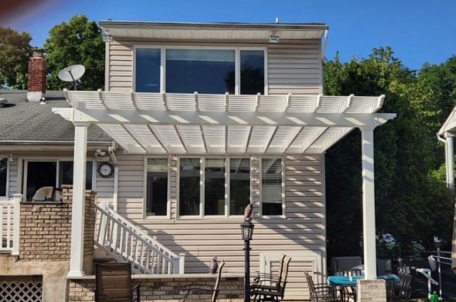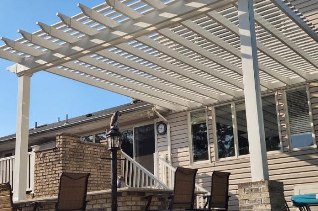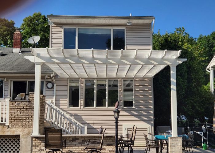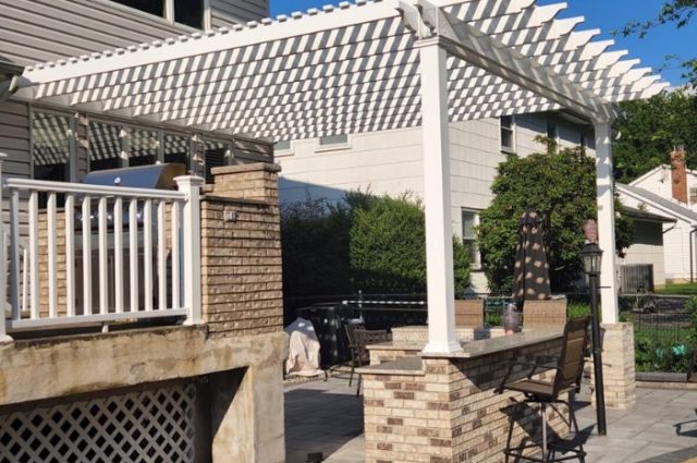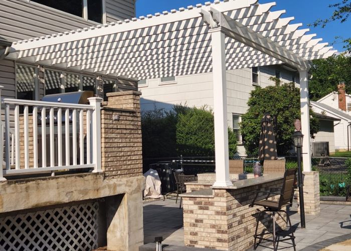 This attached pergola elegantly frames an outdoor kitchen, with columns placed gracefully on the bar, adding both style and function to the space.