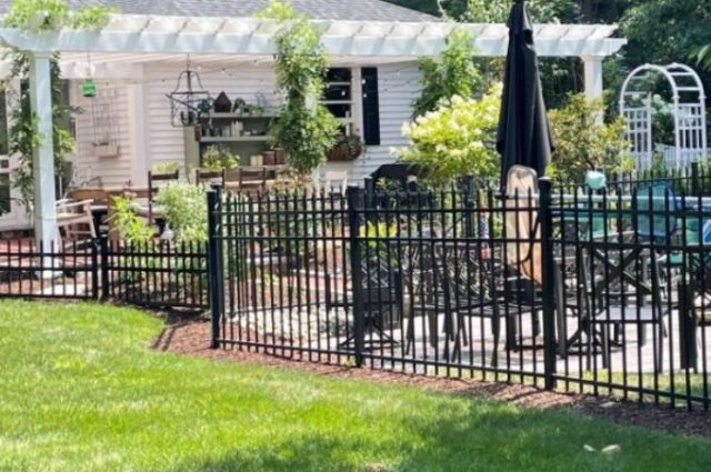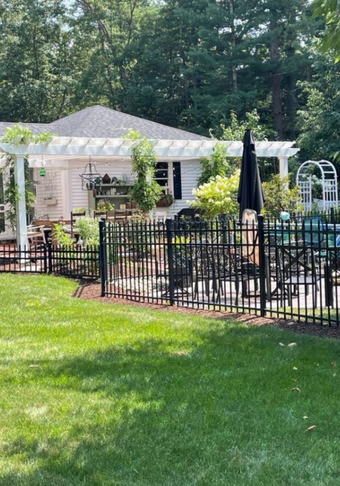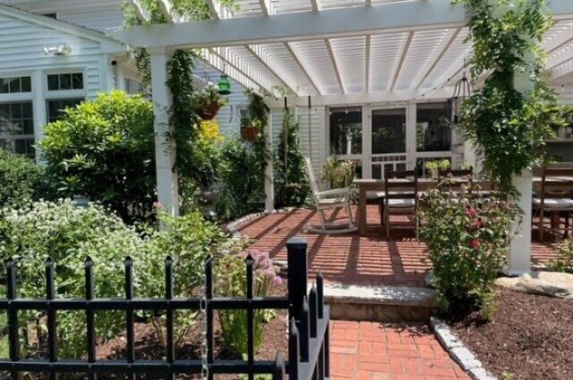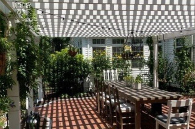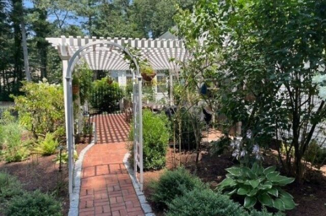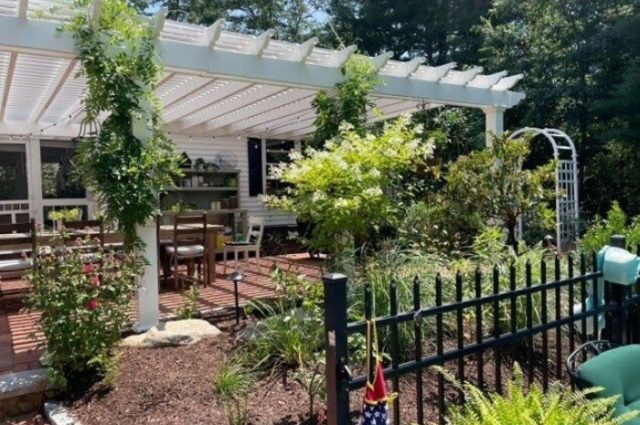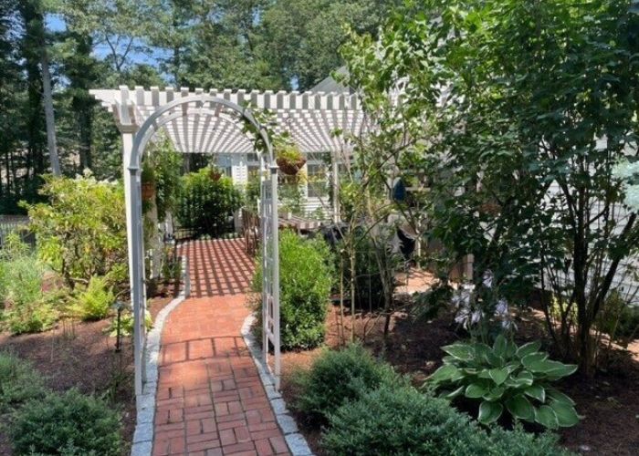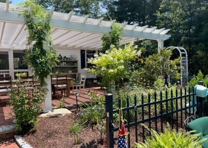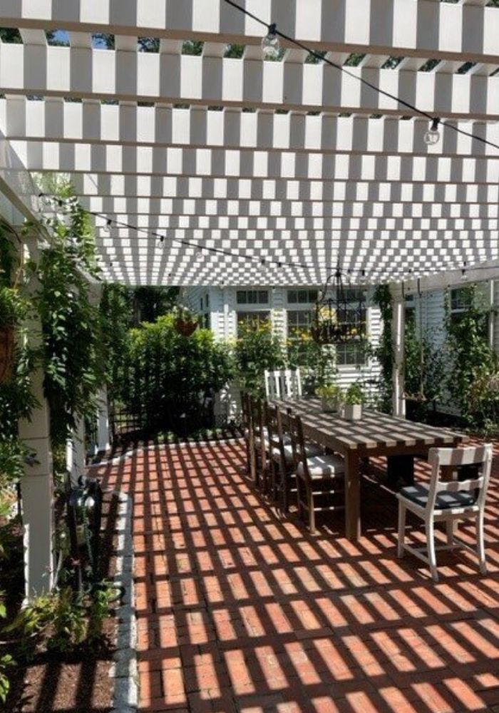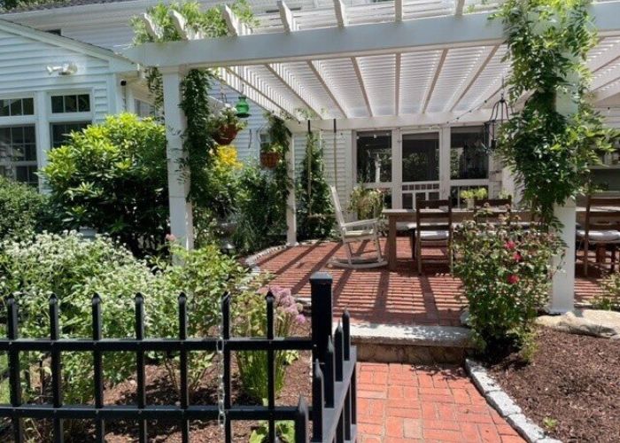 This attached pergola provides a shaded retreat over a brick patio, featuring wood furniture and lush greenery with vines and bushes, creating a serene outdoor escape.